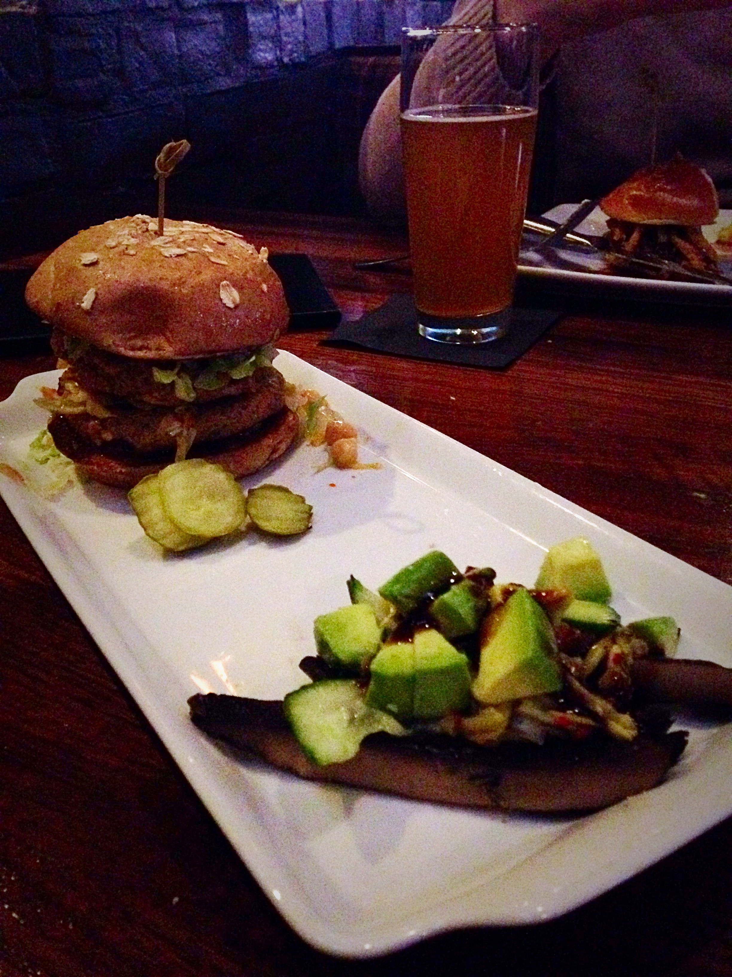 encouraged me to expand my horizons and venture out to other items on the menu. We started with the Triple Dip, an appetizer board featuring whipped goat cheese, peppadew pepper jam, hummus, guacamole and naan bread. The portions were plentiful, and each sauce complimented the others. My favorite was the goat cheese mixed with the peppadew jam. For dinner, I tried the Vegan Quinoa Burger. The burger itself was obviously homemade and had a great flavor, but if I were to order it again, I’d ask for extra jam to counteract the dryness of the bean pattie. Mr. WACH ordered the Stilton Bleu Cheese Burger, featuring pear-bacon and fried onions, and there wasn’t a bite left on his plate at the end of our dinner. Pair those two burgers with a large craft beer selection and a knowledgeable server, and we’ll definitely be back for another visit.