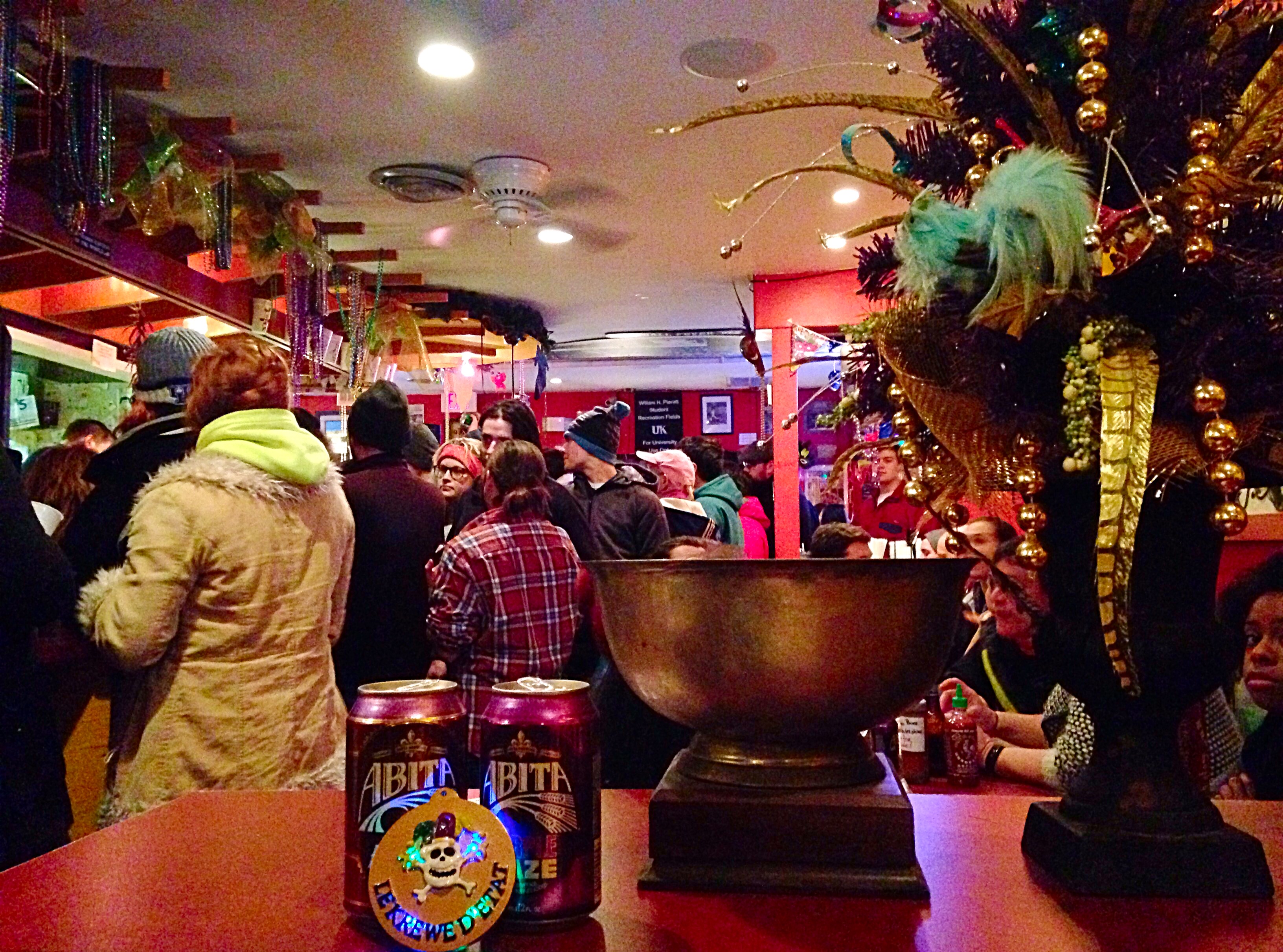 SNAPPED: Even a record snowstorm can’t keep Lexington residents away from their favorite Cajun spot on Fat Tuesday! Bourbon n’ Toulouse, a Cajun n’ Creole Joint, has been delighting diners in the heart of Chevy Chase since 2004. They offer delicious Louisiana cuisine in a great, hole-in-the-wall atmosphere. Catering to meat lovers, seafood fans, and vegetarians alike, everyone can find something that suits their tastes at BnT — especially their famous bread with spiced, melted butter. They’re always busy on Fat Tuesday, but this year, crowds were even bigger because BnT gave stir-crazy Lexingtonians a reason to venture out into the blizzard to grab an Abita, a piece of King Cake, and a heaping helping of gator étoufée, gumbo, or shrimp boil (crawfish were delayed by the storm), among many other fan favorites. Mr. WACH and I stopped by for dinner, and the wait was well worth it. BnT was decked out in beads and Mardi Gras colors, and everyone was in great spirits despite the dreary weather. We shared a table with two nice Mardi Gras enthusiasts and enjoyed watching part of the UK vs. UT men’s basketball game with at least fifty of our neighbors. If you’re in the mood for a little Cajun and Creole, I highly recommend visiting Bourbon n’ Toulouse on Euclid for lunch, dinner, or takeout. We had a great tailgating spread from BnT for the UK vs. LSU football game last fall, and it was a big hit all around!