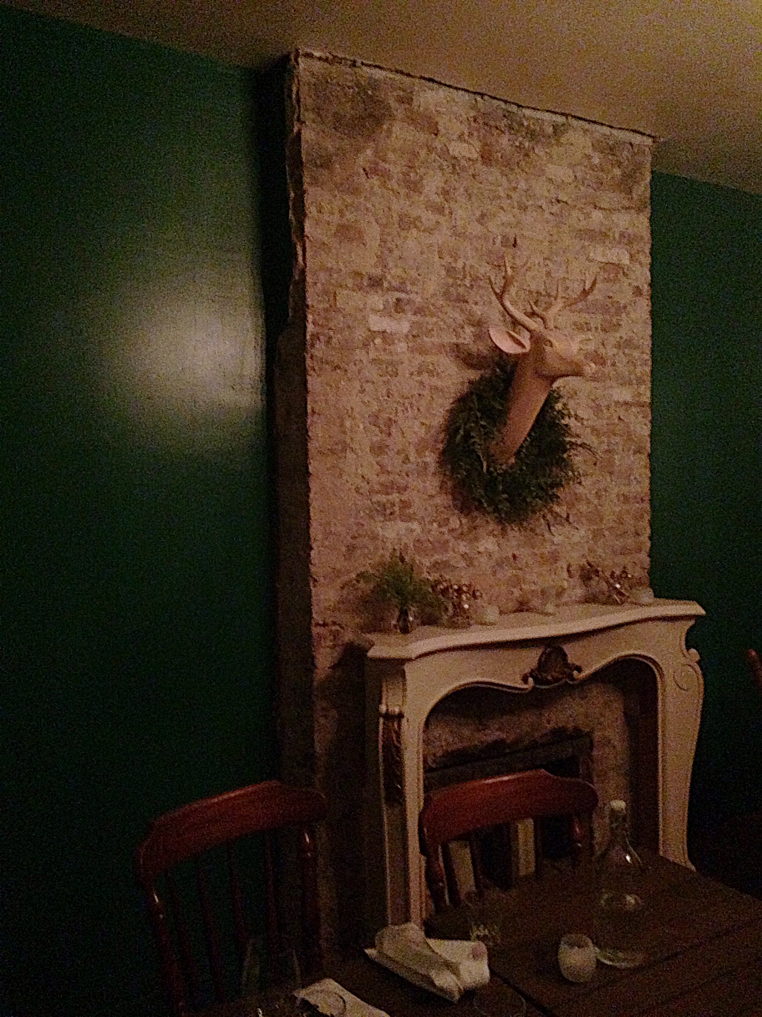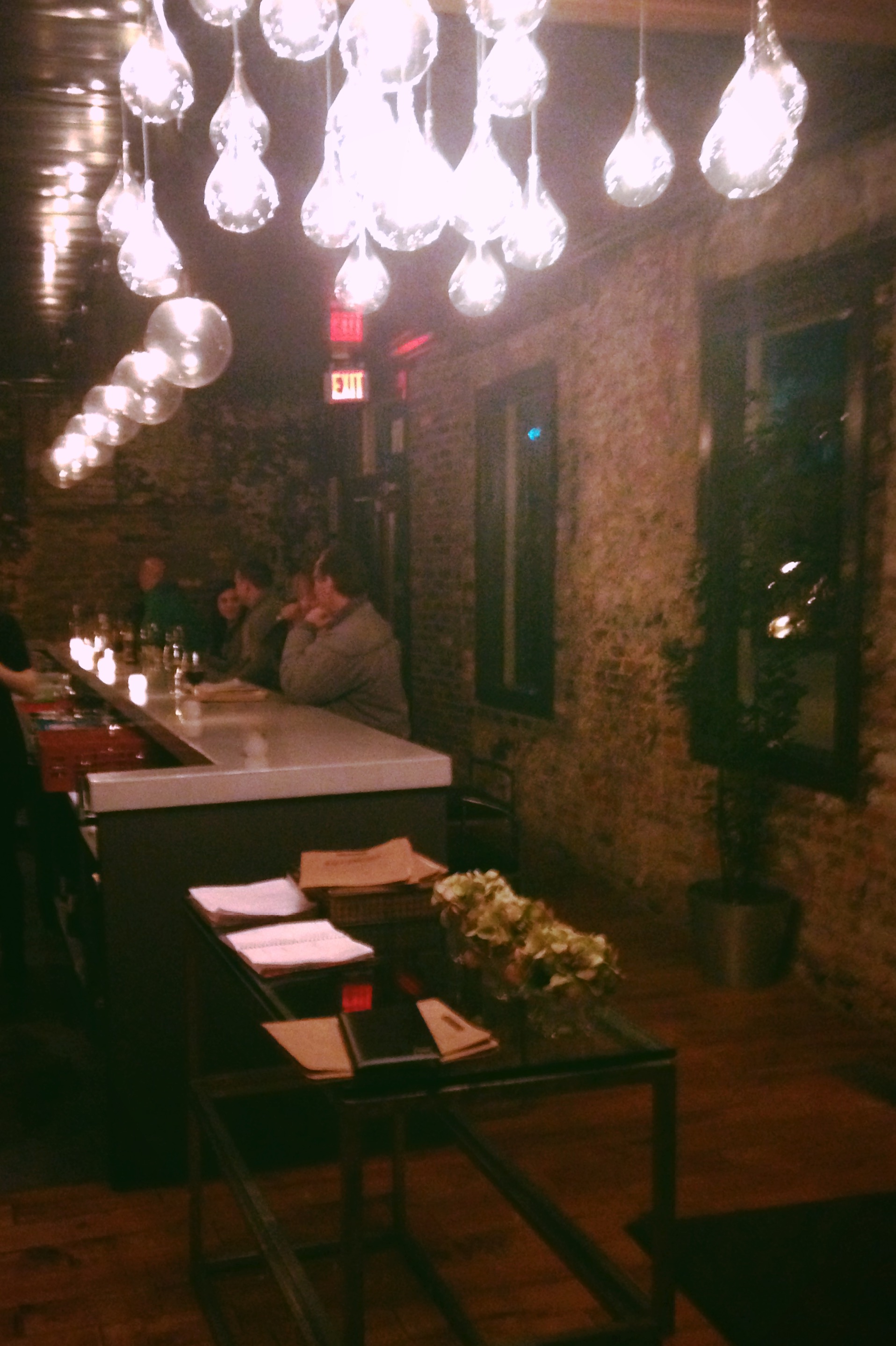 As more of a visualist than a foodie, my favorite part of Enoteca is its decor.  The restaurant’s atmosphere feels inviting from the moment you walk in.  It’s housed in a building that dates back to the 1830’s or 1840’s, and the front room showcases beautiful exposed brick that Iooks original.  Clear pendant lights illuminate the modern white bar top and the open metal and glass shelves holding many nicely arranged bottles of spirits.  Off to the left is a lounge with beautiful wood on the walls and floors, a multi-level wine rack that adds interest to the back wall of the room, and three sets of accent chairs and low tables for informal gatherings.  The next room is quite a bit more modern, featuring bar seating on one wall and multiple small tables with chairs and a bench on the other wall.  Trendy mirrors reflect light from candles and recessed ceiling lights to create a great dining room.  The back room has a warmer, woodsy feel with a restored brick fireplace, traditional white chandelier, and reclaimed wood dining tables.  A wooden, carved bust of a buck deer watches over the room from above the fireplace with a wreath of greenery around his neck.
